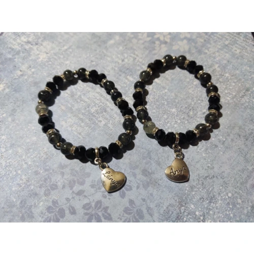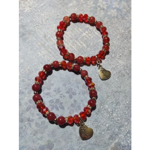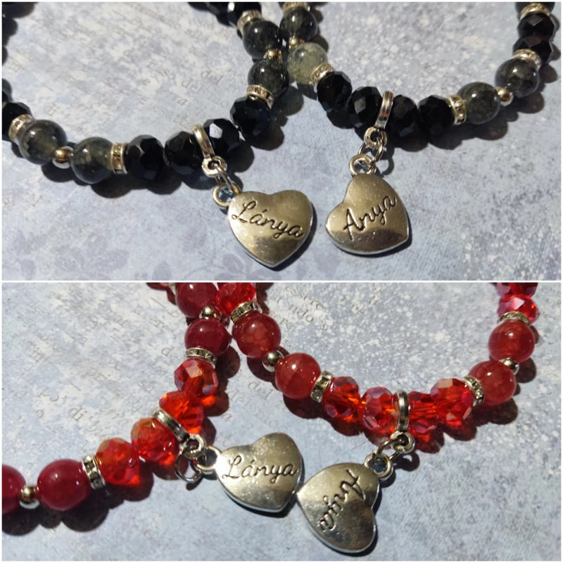 Műanyag gyöngyökből, rondellákból összeállított gumis karkötő, fém "Anya", "Lánya" szíves fityegővel.