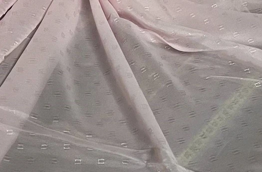 Rózsaszín , áttetsző, finom textúrájú szövet apró geometrikus (téglalap alakú) mintával.