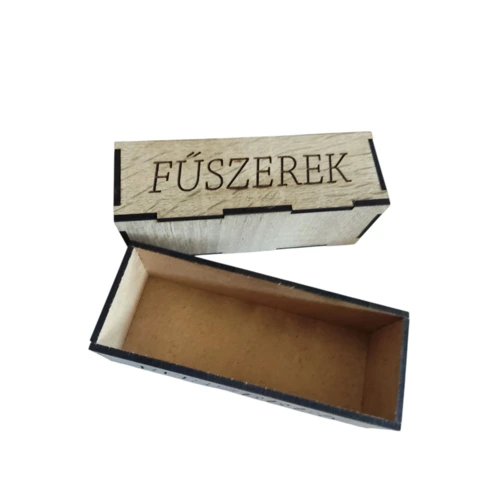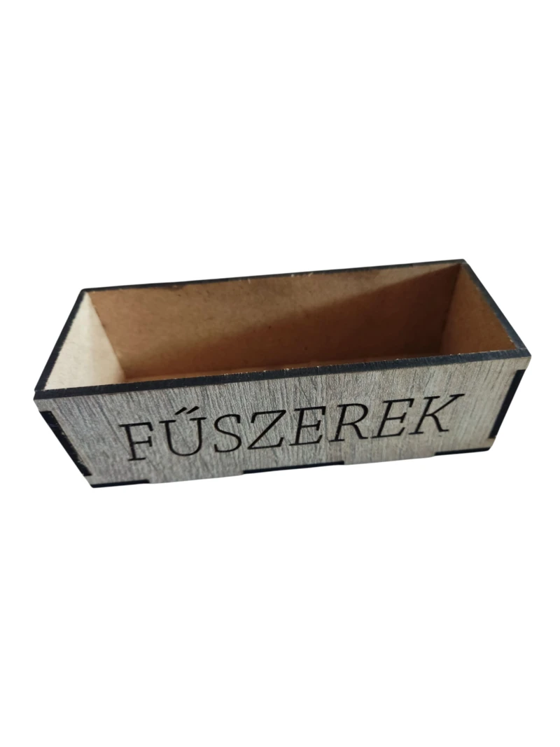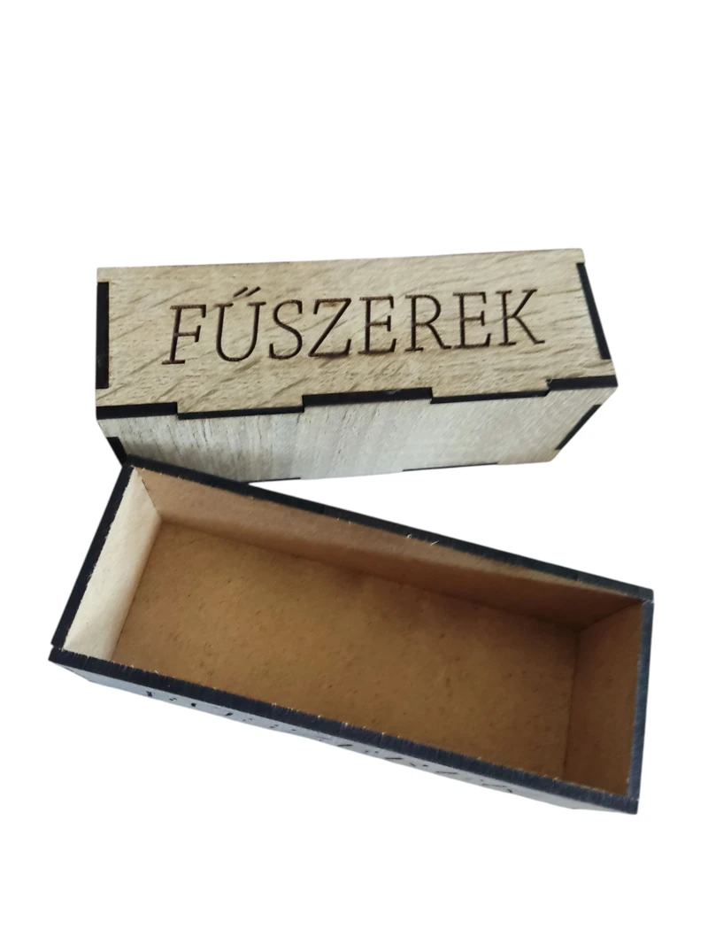 Egyedileg tervezett és gravírozott fűszertartó minőségi fából, kisebb fűszeres tasakok számára.