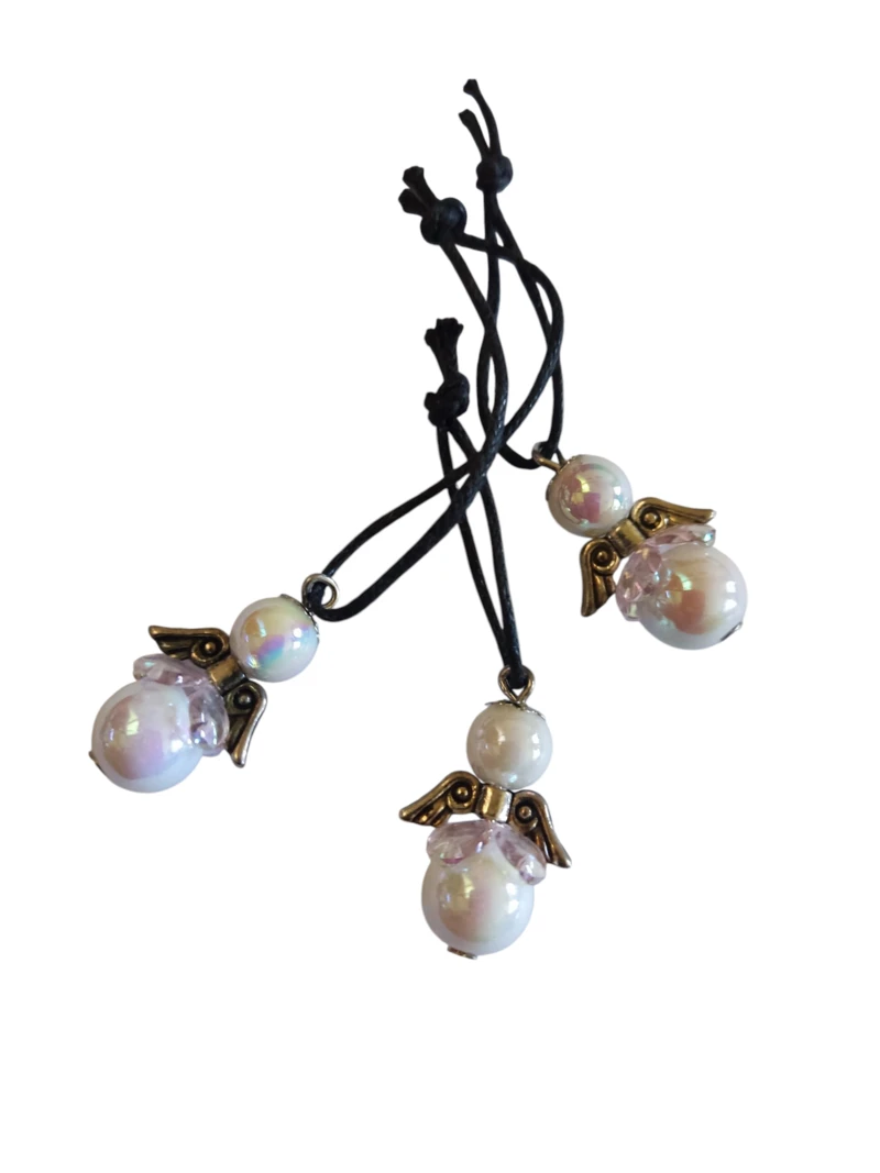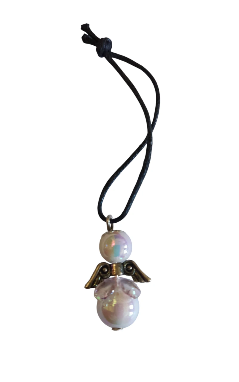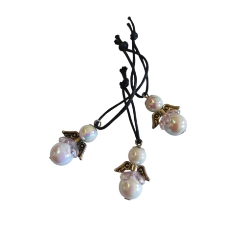 Teklagyöngyökből, áttetsző virágból, tibeti ezüst szárnyból készült angyalka.