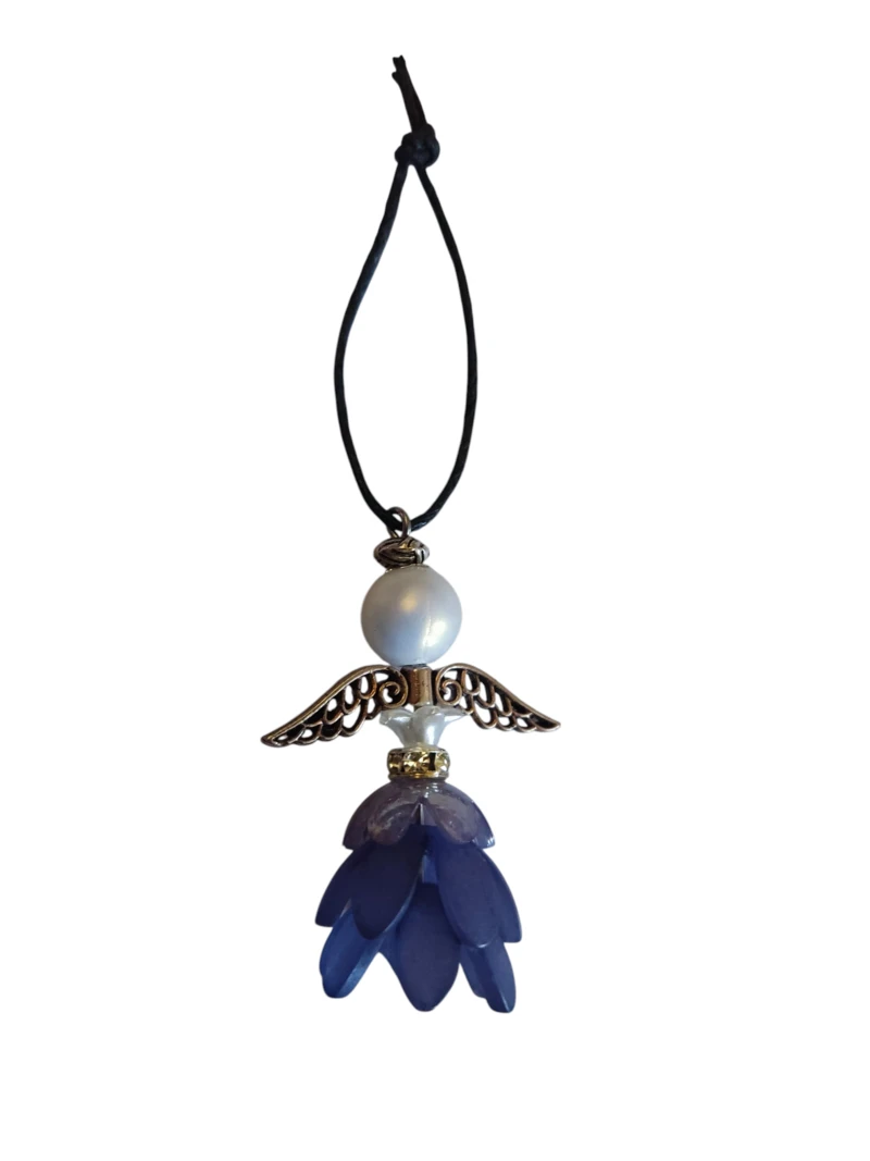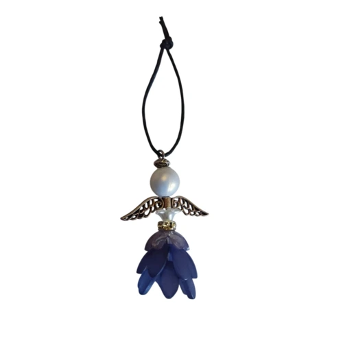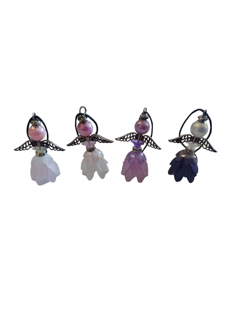 Virág formájú gyöngyökből, teklagyöngyből, köves köztesből és antikolt szárnyból összeállított angyalka - halványrózsaszín, világoslila és sötétlila szoknyában.