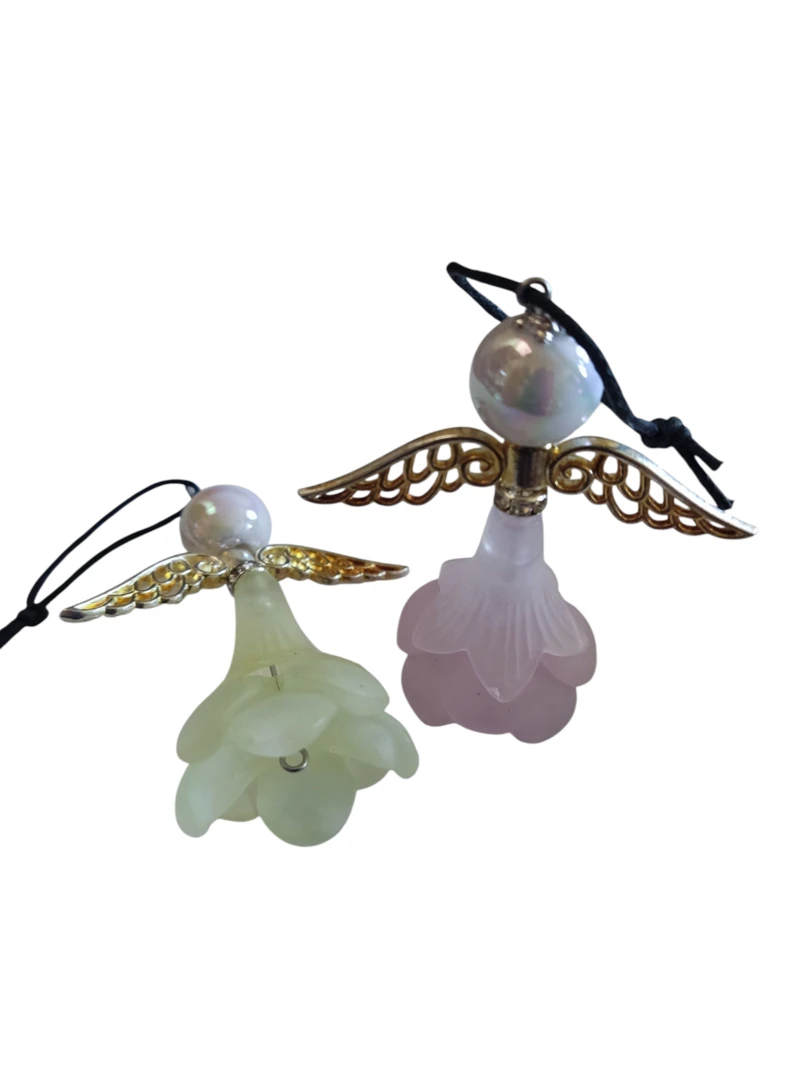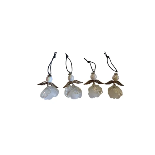 Nagy méretű virágos gyöngyök, arany színű szárny és teklagyöngy felhasználásával készült angyalka.