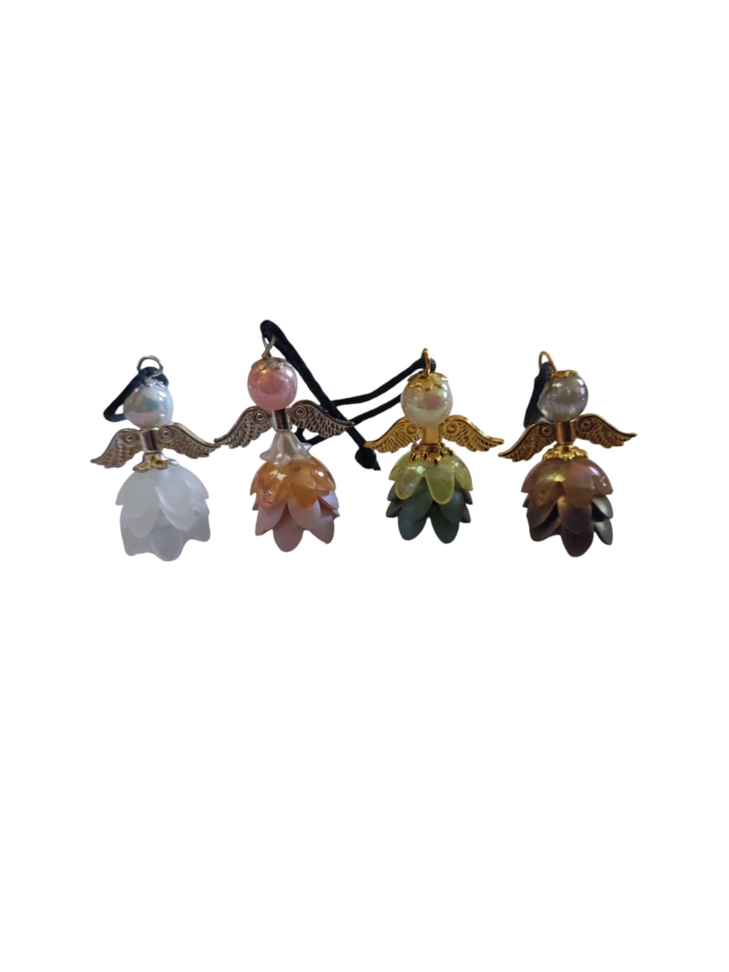 Virág formájú gyöngyök, arany és ezüst színű szárny, teklagyöngyök felhasználásával készült angyalka.