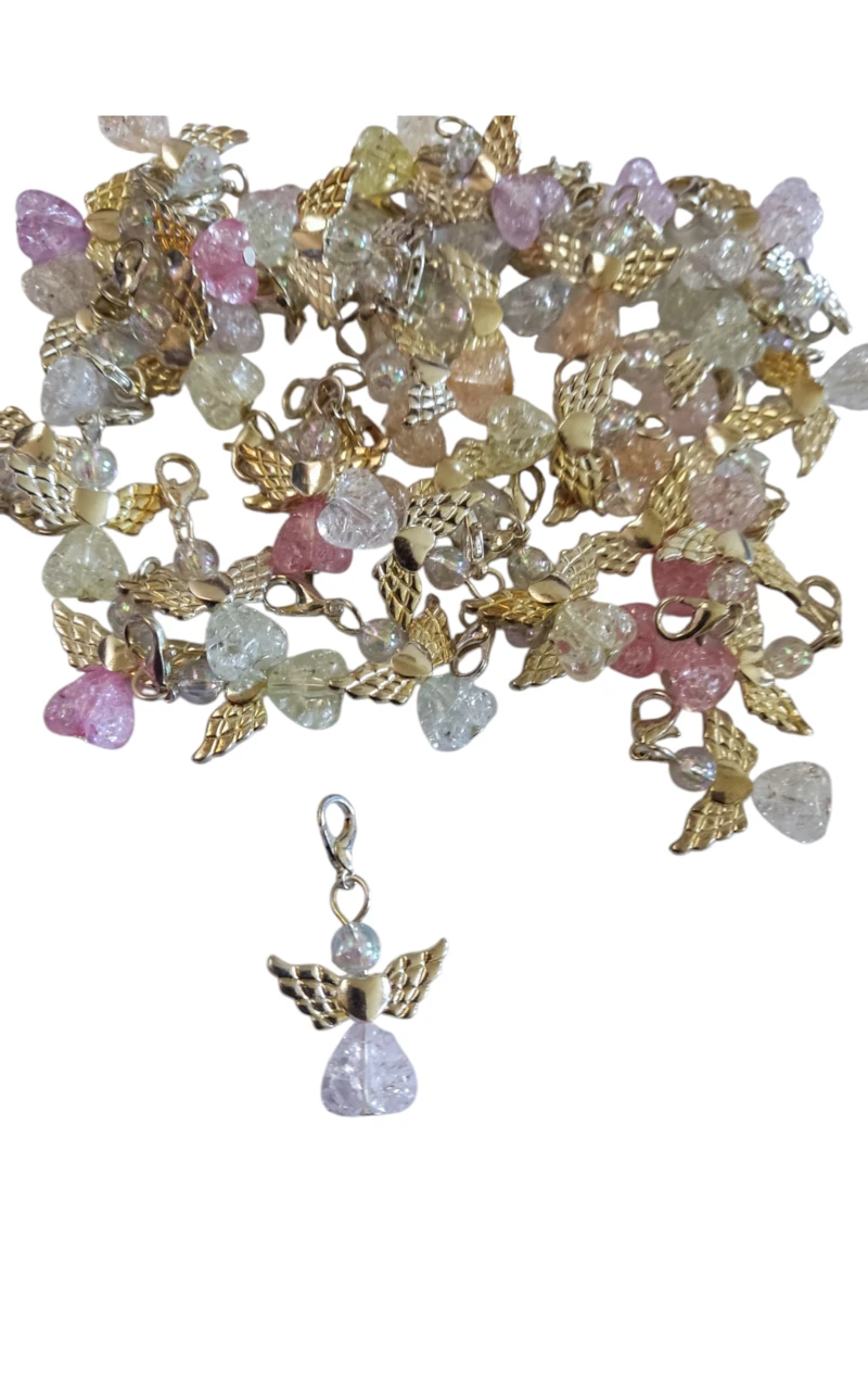 Változó színű szívecskés gyöngyökből, szíves szárnyból és áttetsző gyöngyből összeállított angyalka.