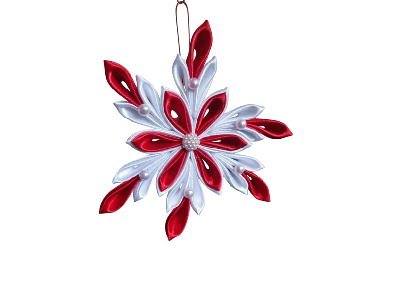 Piros / fehér szallagokból készült hópihe, gyöngyökkel.