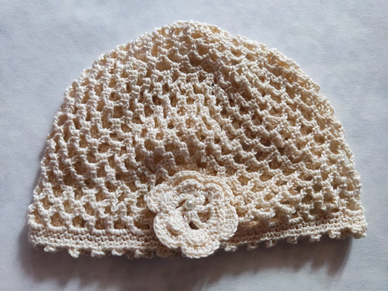 Drapp színű horgolt baba sapka virággal.