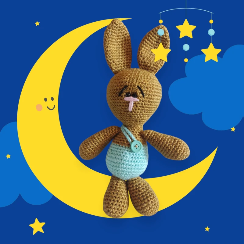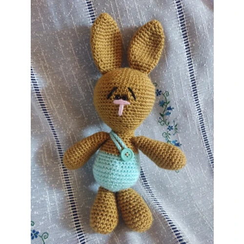 Horgolt fiú nyuszi kantáros nadrágban.