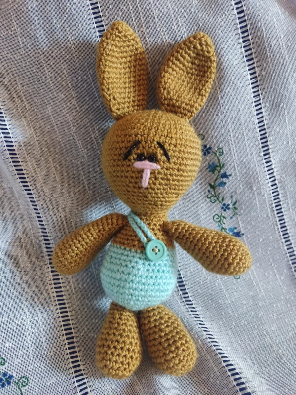 A barna nyuszi kék nadrágján gomb található. Biztonsági szemmel készült, orra, szemöldöke hímezve van.