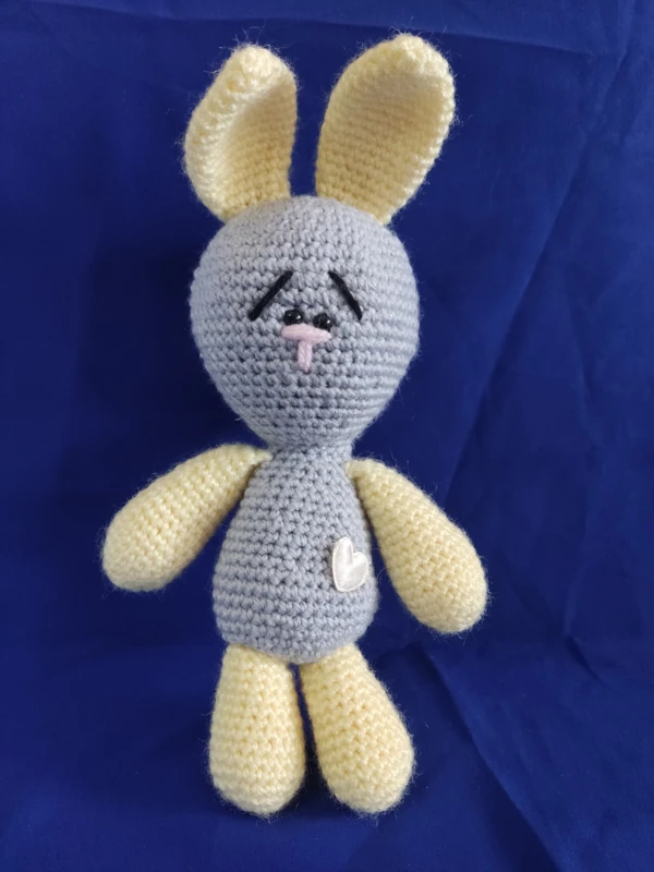Egyedi horgolt nyuszi szatén szivecskével, biztonsági szemekkel, hímzett orral és szemöldökkel.