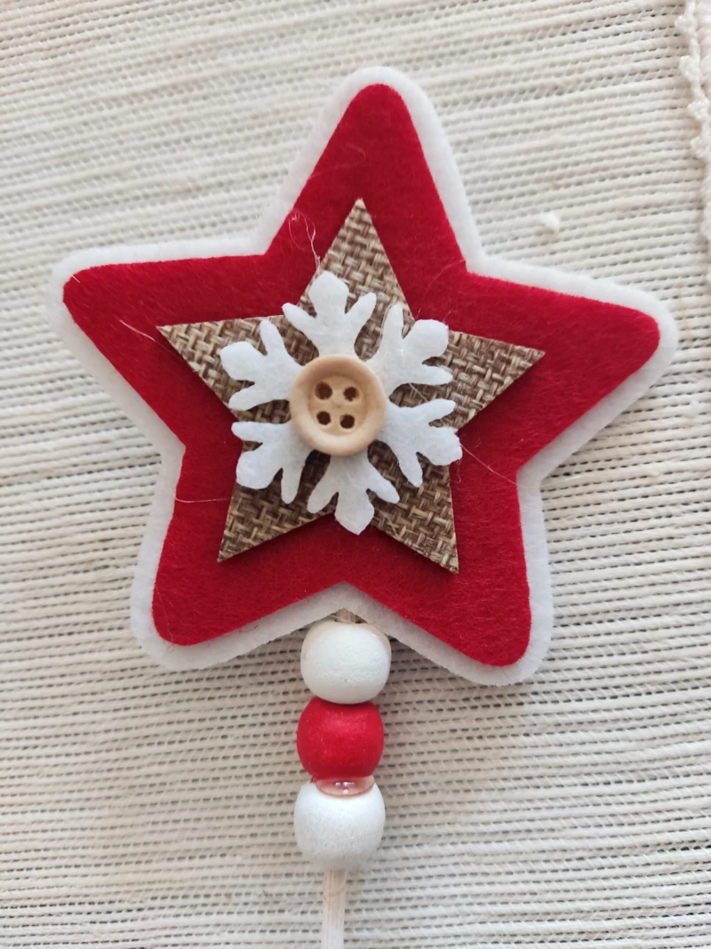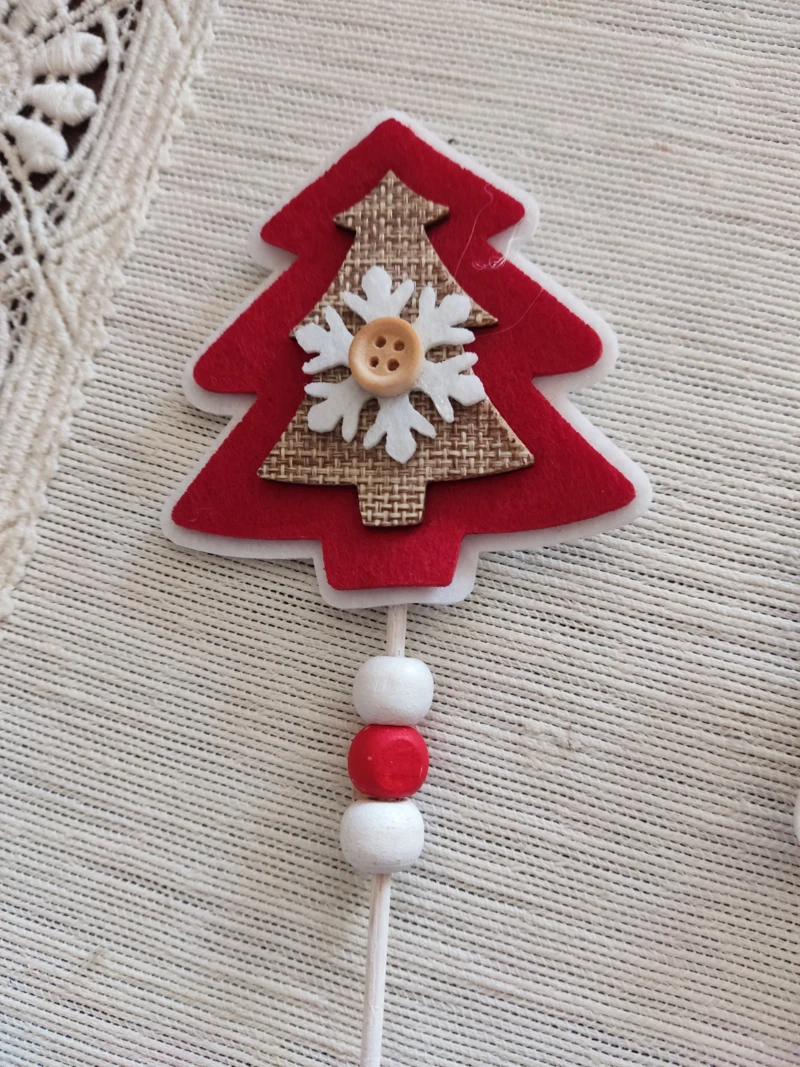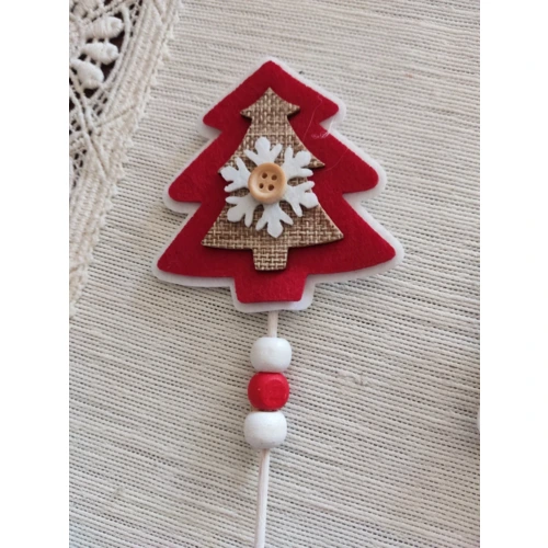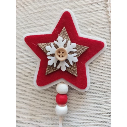 Karácsonyi pálcás filcdísz fagyöngyökkel. Kétféle variációban kapható: csillag és fenyő formában. Mindkettőt zsákvászon, gomb zsinór is díszíti.