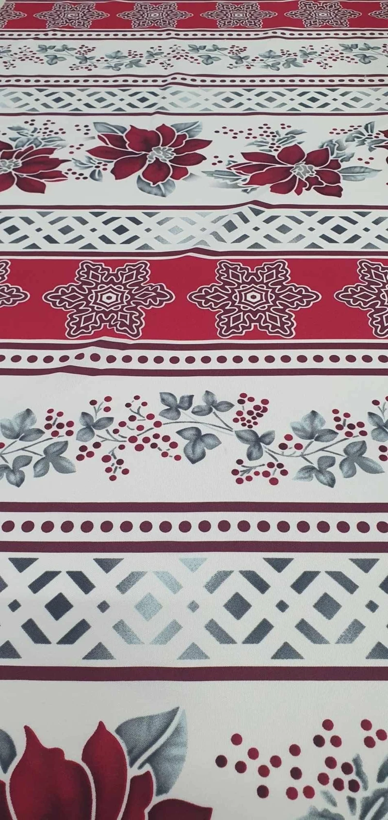 Karácsonyi panama anyag, fehér alapon hópihe, mikulásvirág sormintával.