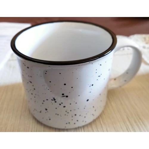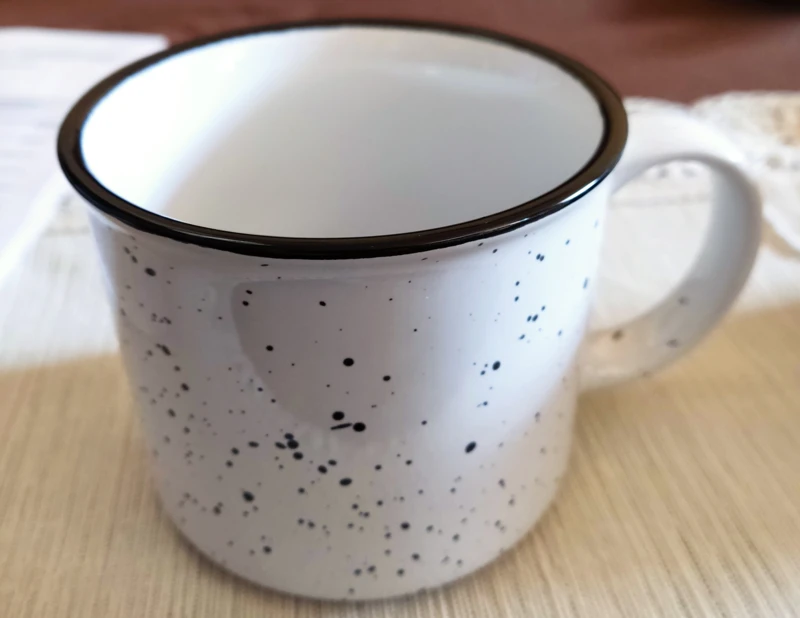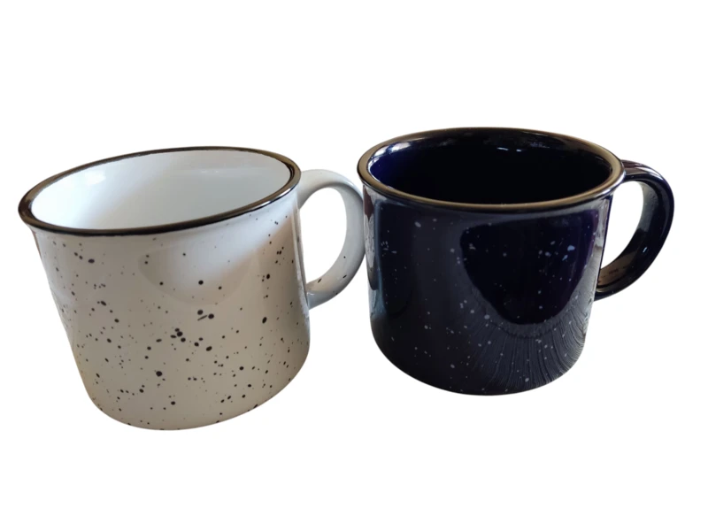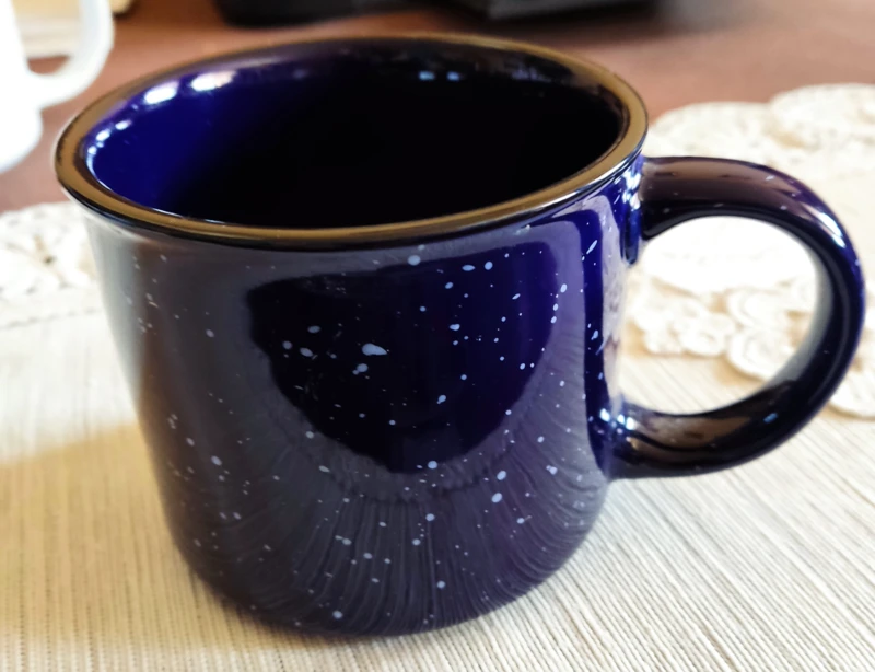 Sötétkék és fehér alapon apró paszatos mintás bögrék.