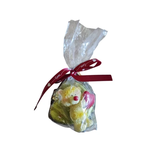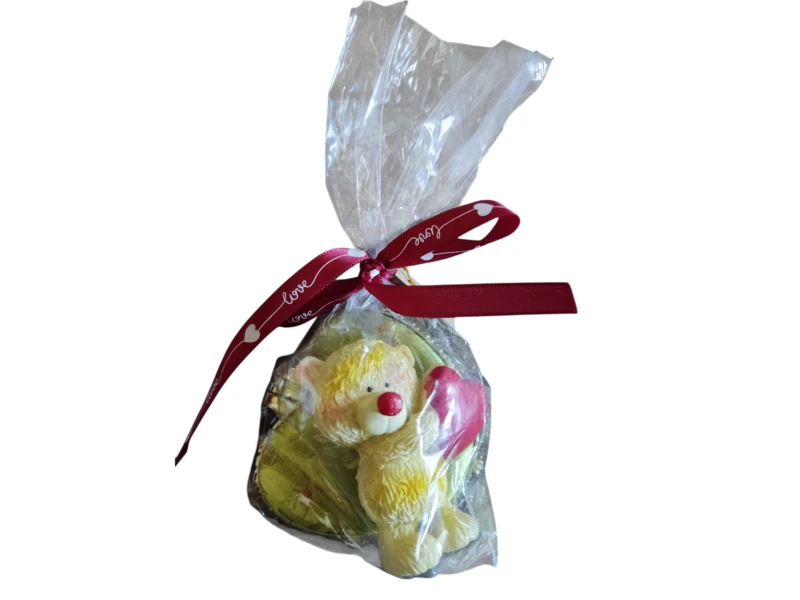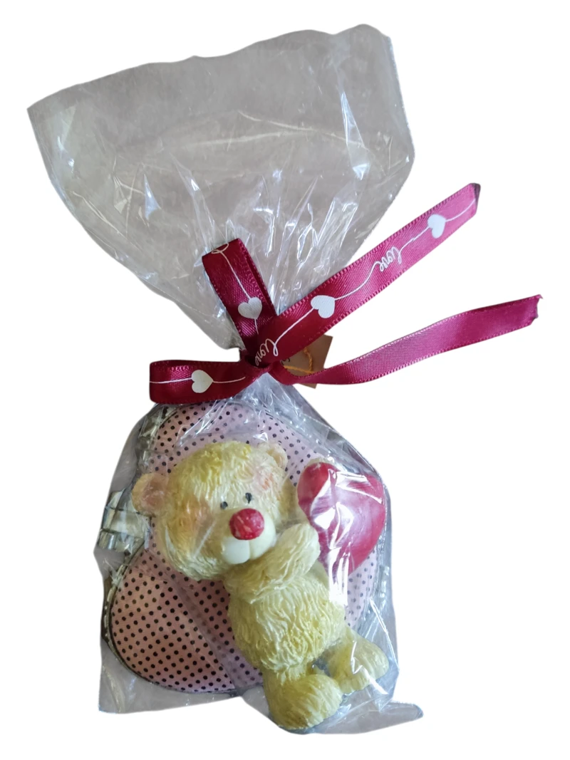 Piros szívet tartó maci textil bevonatú, kinyitható, szív alakú zsebtükörrel.