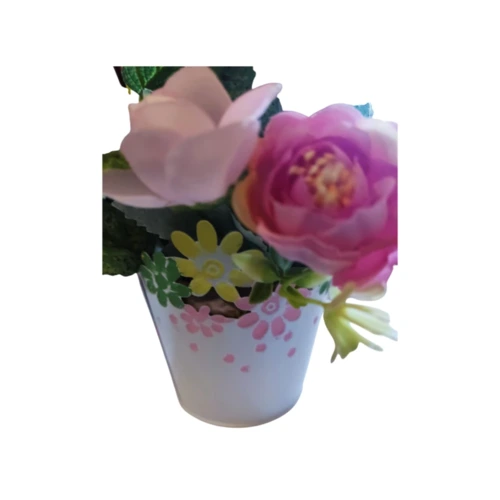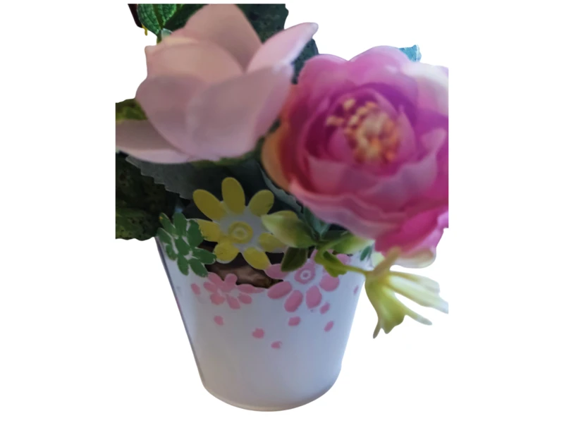 Virágcsokor fém, virágos kaspóban fehér madárkával és fa házikóval.