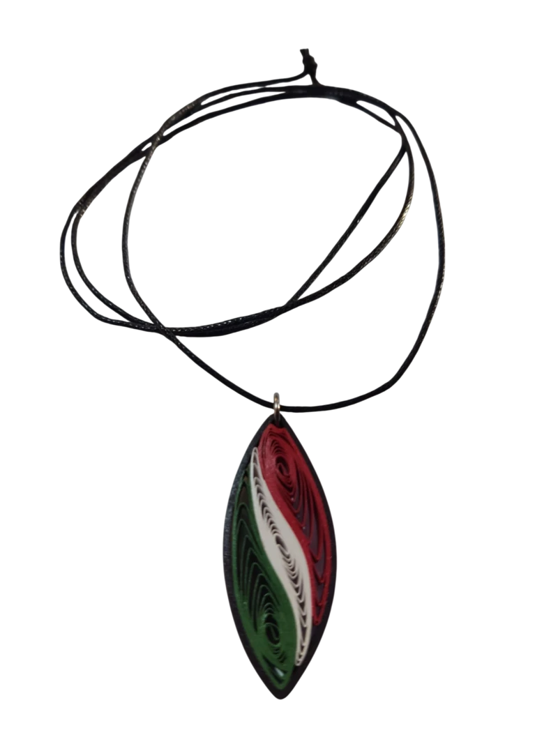 Papírcsíktechnikával készült magyaros medál, viaszolt szálon.