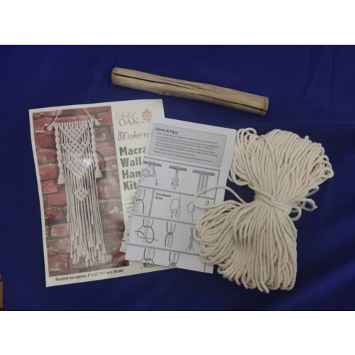 Makramé fali dísz készítő csomag. A csomag tartalmazza a szükséges mennyiségű fonalat, a fa rudat, fém gyűrűket és  képes elkészítési útmutatót, amely segítségével kezdők is bátran belevághatnak a makramézásba