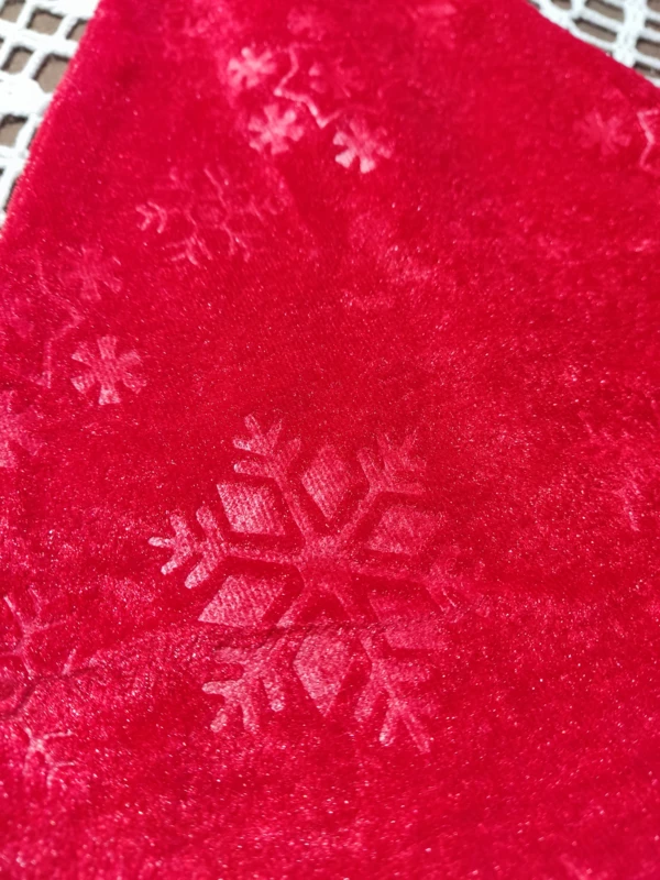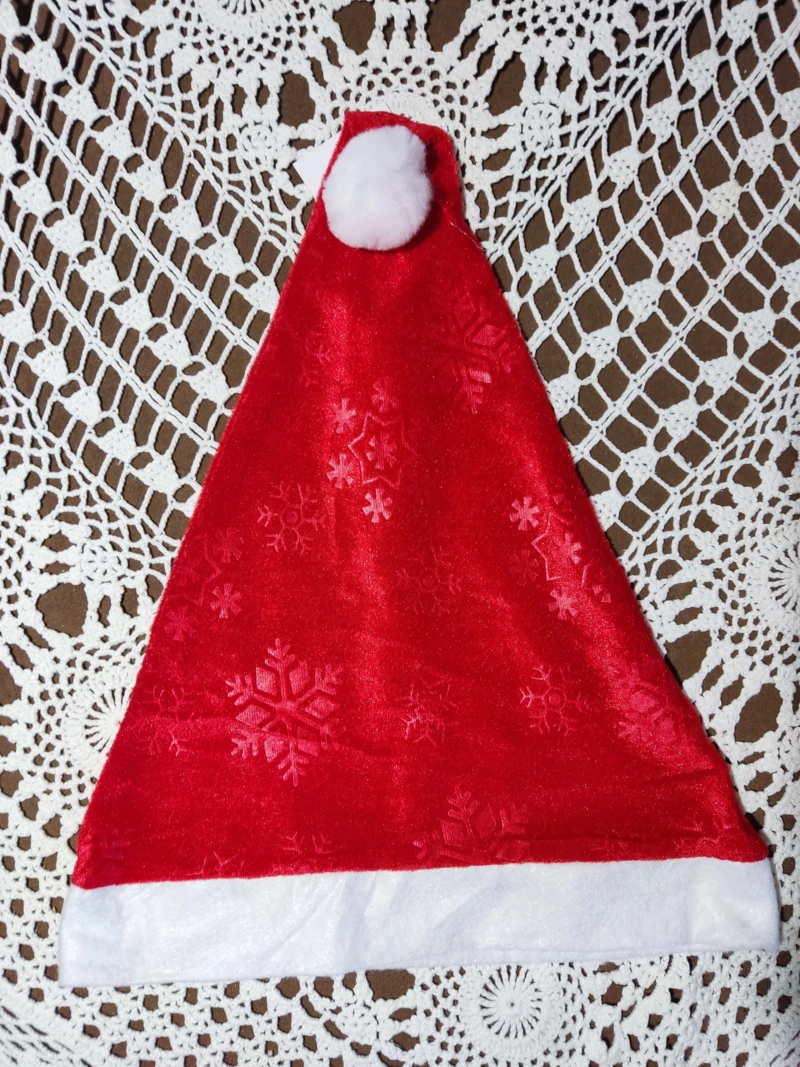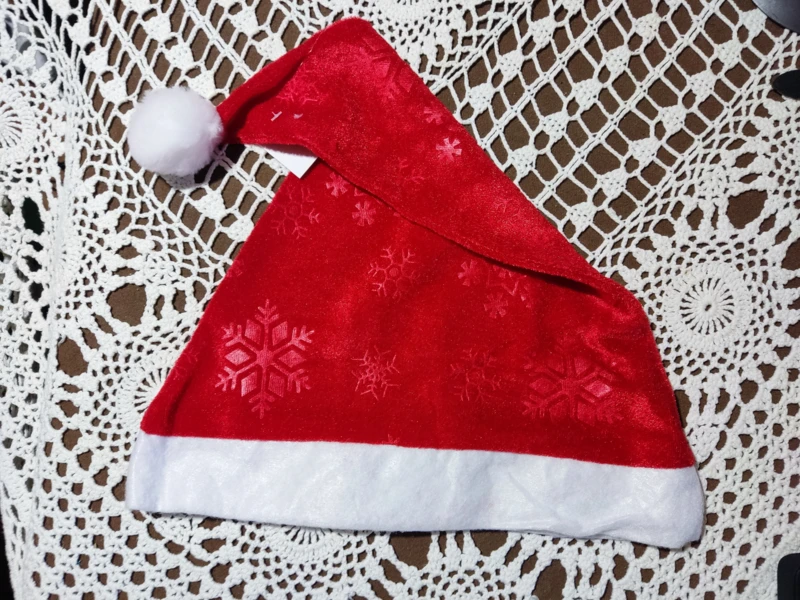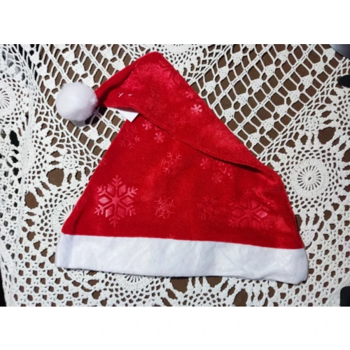 Mikulás sapka vékony, nyomott mintás piros plüs és fehér filc anyagból.