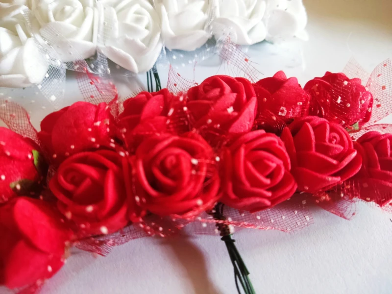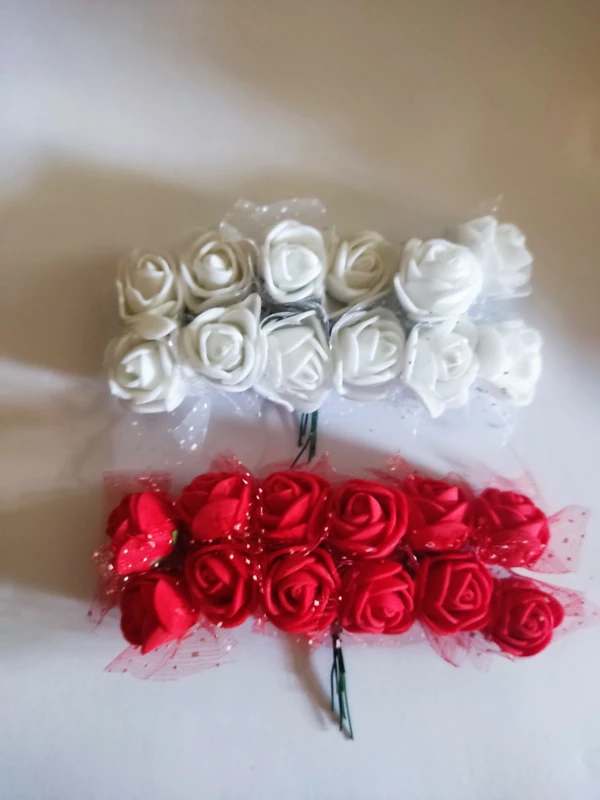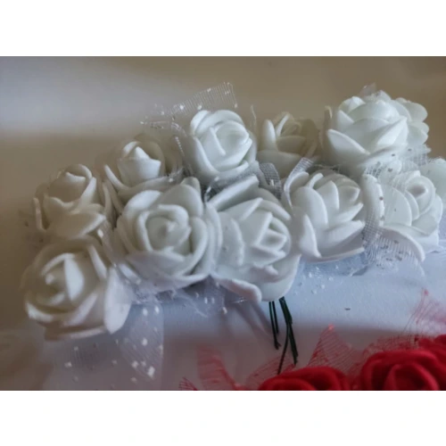 12 db-os polifoam rózsa készlet piros és fehér színekben, fém szárral, zöld csészelevelekkel és pöttyös tüll kiegészítővel.