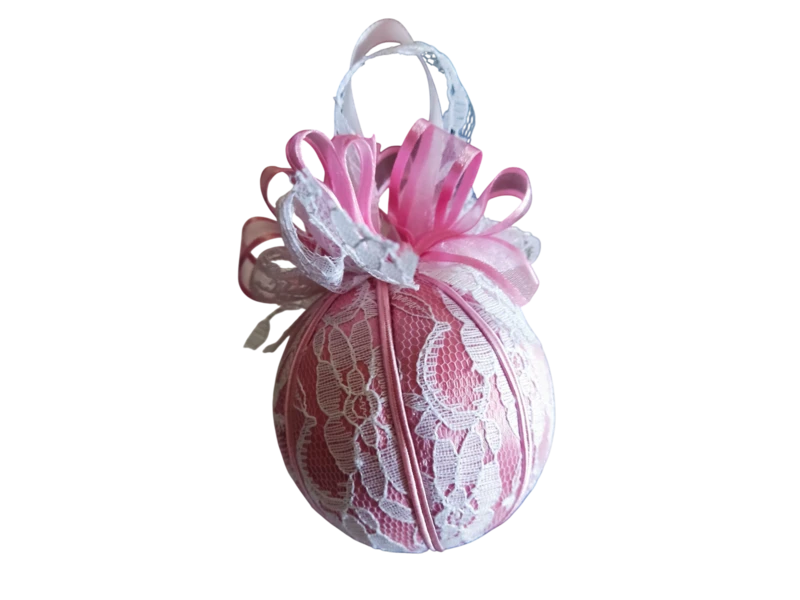 Szatén és organza szallagokból, csipkéből , hungarocell gömbből készült dekoráció.