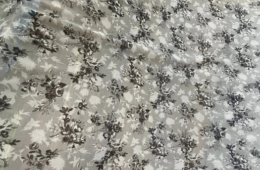 Áttetsző, finom szövésű textil, amelyen virágmintás motívumok láthatók. Az anyag típusa hasonlít a tüllhöz. Egy irányban rugalmas. Anyagösszetétel: 100% PES