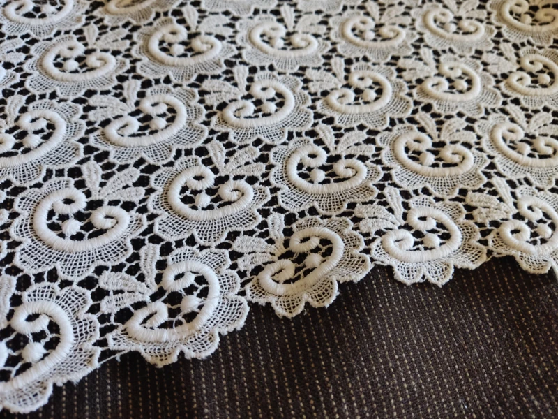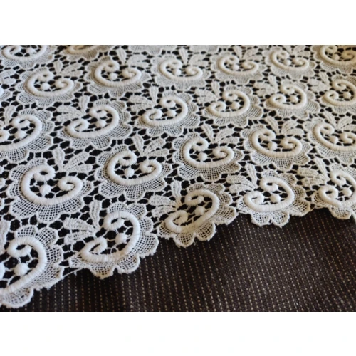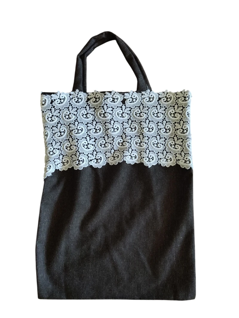 Újrahasznosított szövetből készült táska, széles fehér csipkével.