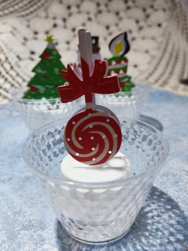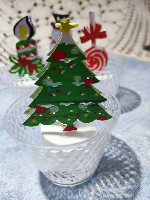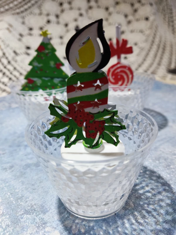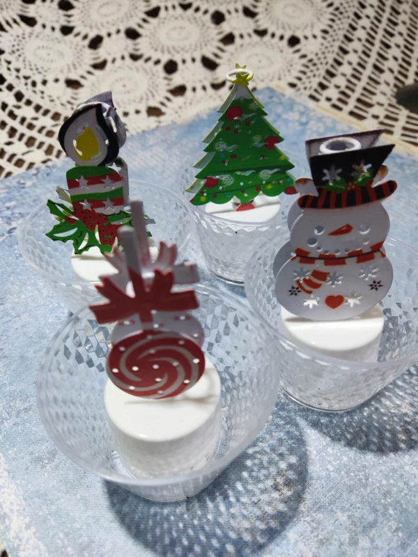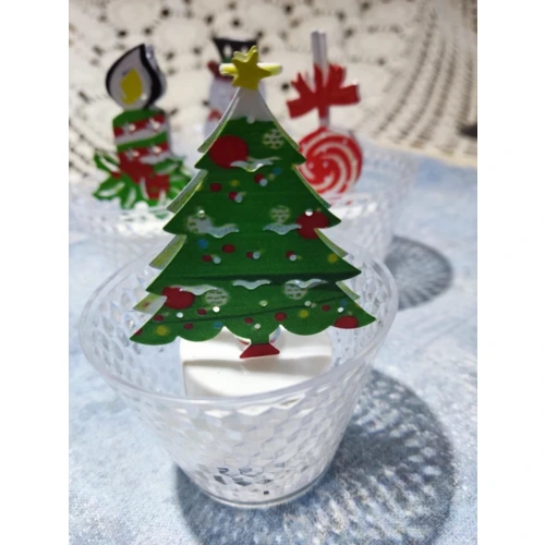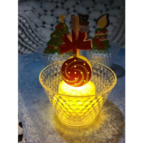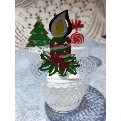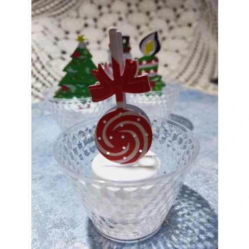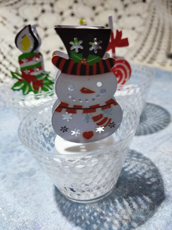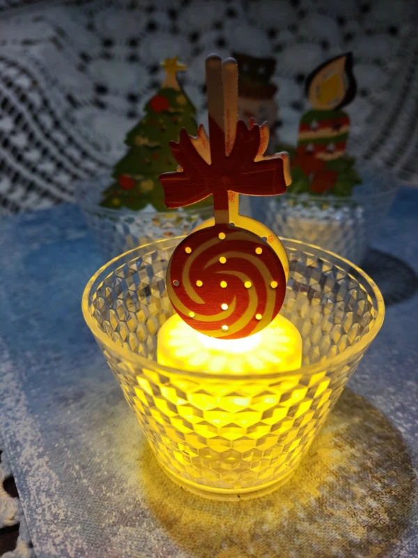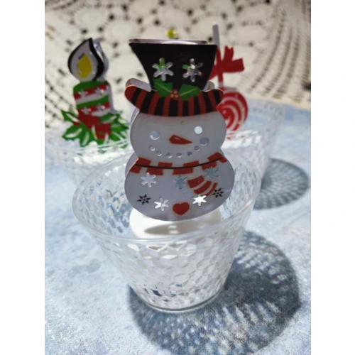 Világító karácsonyi dekoráció. Vastag műanyag pohárkában fém fenyő, gyertya, hóember és cukorka figura.