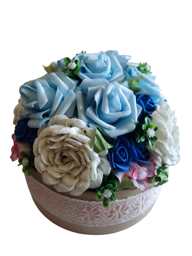 Polifoam és papírvirág csokor 19 cm átmérőjű papírdobozban.
