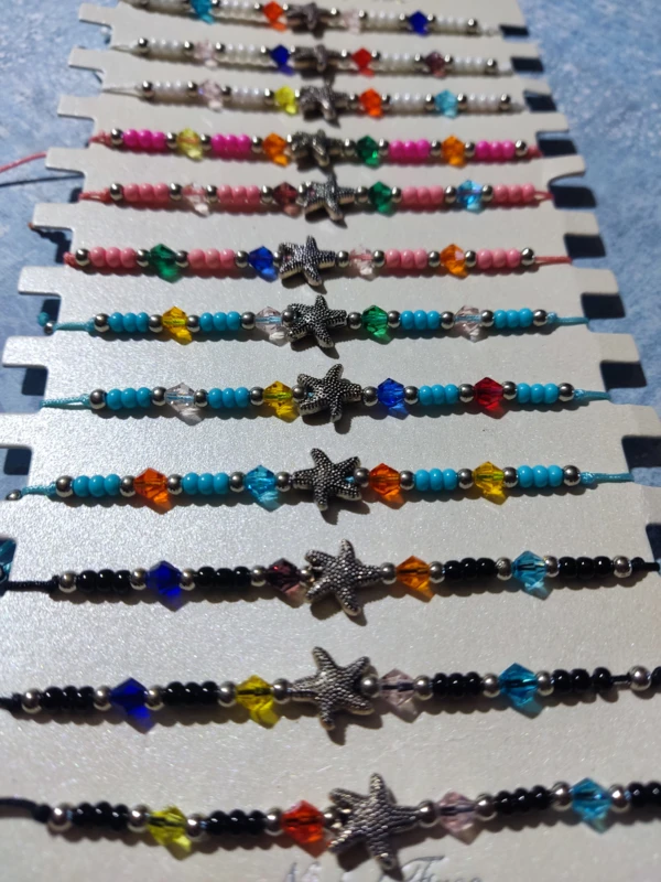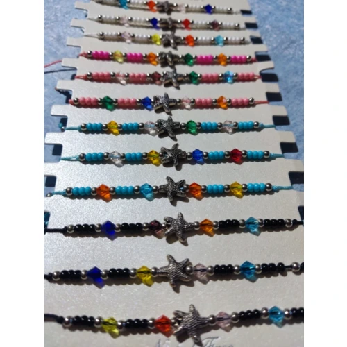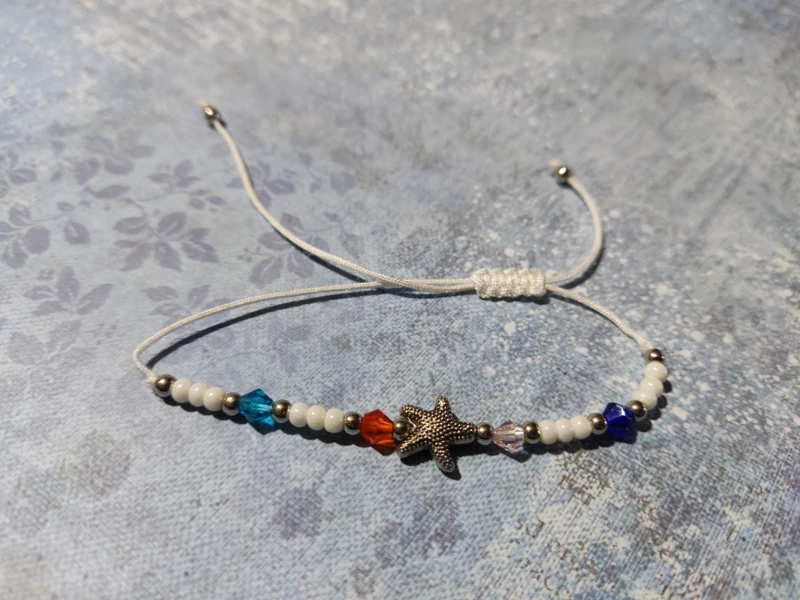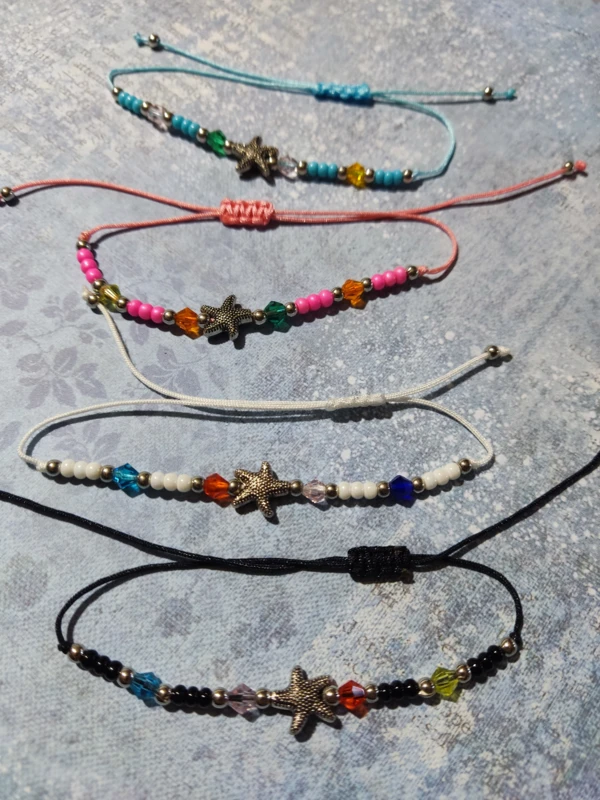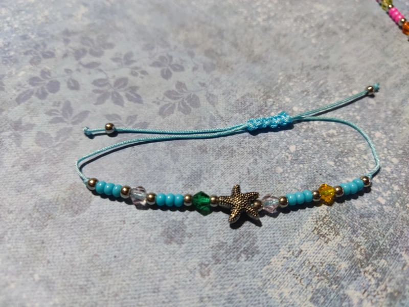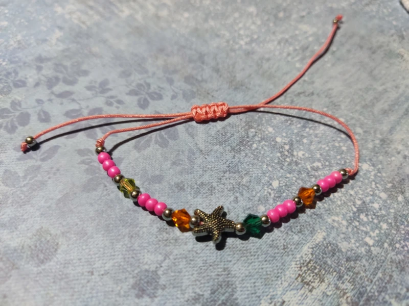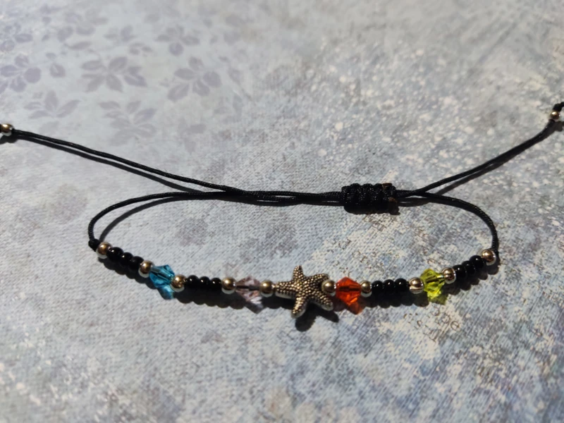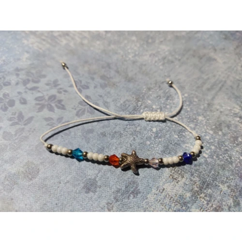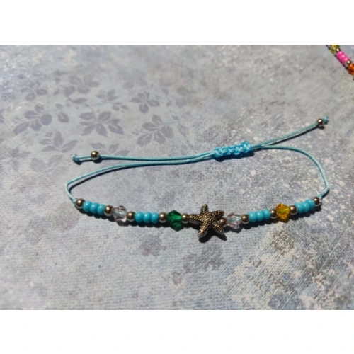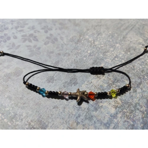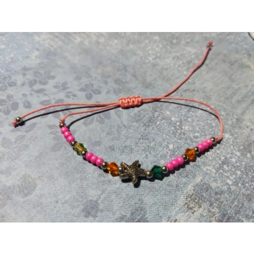 Színes zsinórból csomózott karkötő színes gyöngyökkel, fém csillaggal.